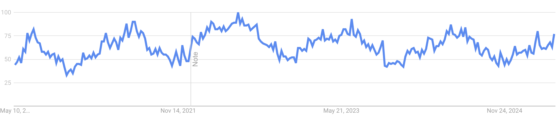 “Airbnb Chicago” search volume for the United States from the last 5 years broken down by metro. Screenshot from Google Trends. Highest peaks in search volume occur in June and July each year.