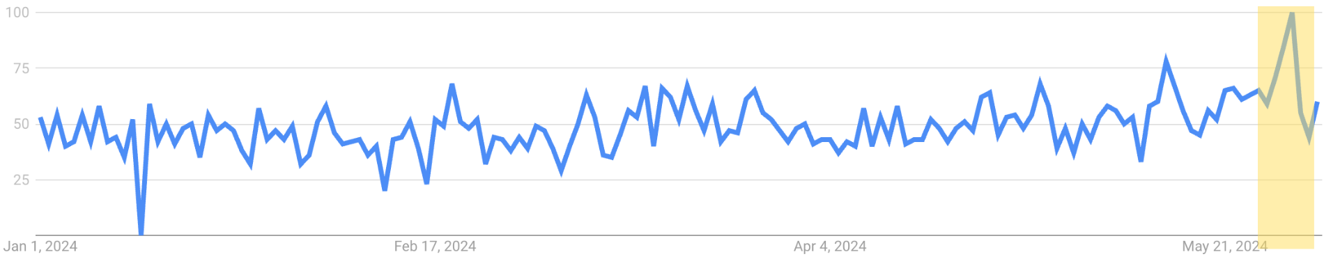 Last year, the Wednesday AFTER Memorial Day - May 29th - had the highest number of searches for the first half of 2024 (pictured below).